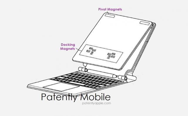 配件采用模块化设计,键盘区域可以相对显示模块移动。保护壳外覆材料在进行过程中会形成支撑结构,两侧有一个容易分离的凹槽。专利强调,系统支持至少两组枢轴磁铁协调,提高连接可靠性。