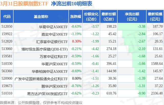 当天有 224 只股票指数 ETF 资金净流出,其中华夏中证在净流出中排名第一。 A500ETF(512050)减少了份额 3.57 一亿份,净流出额为 3.38 亿元。