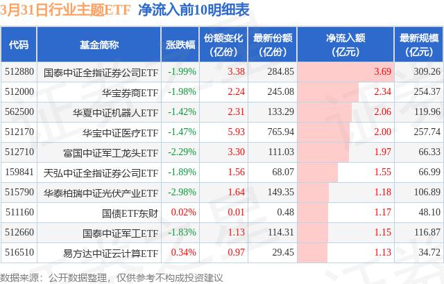 证券之星消息,3 月 31 日行业主题 ETF 总资金净流入基金 31.24 亿元,近 5 一个交易日累计净流入 57.73 亿元,5 在一个交易日内,出现了日合计资金净流入。 4 天(ETF 计算资金流入的方法:(当日 ETF 现场流通份额 - 前一交易日 ETF 现场流通份额)* 当天 ETF 均价,数字仅供参考)。