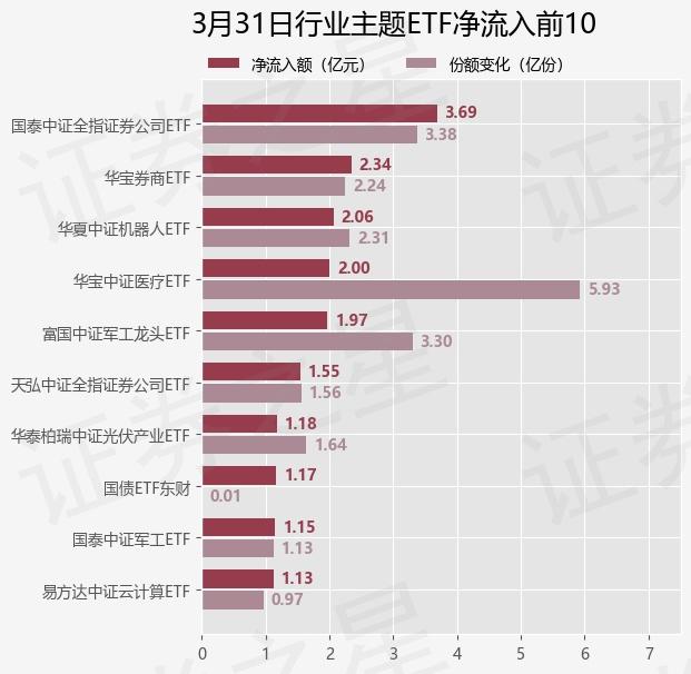 当天有 185 只行业主题 ETF 资金净流入出现,其中国泰中证全指证券公司净流入排名第一。 ETF(512880),份额增加 3.38 十亿份,净流入额为 3.69 亿元。