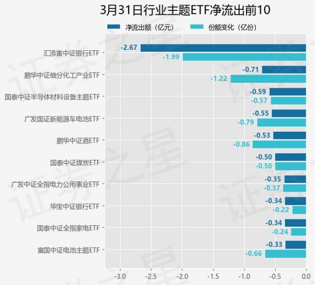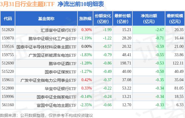 当天有 95 只行业主题 ETF 资金净流出,其中汇添富中证银行净流出排名第一。 ETF(512820),份额下降 1.99 一亿份,净流出额为 2.67 亿元。
