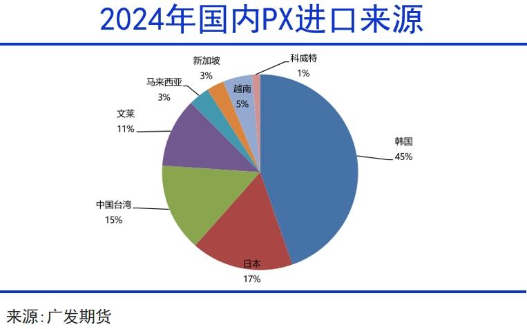 以前,我们国家的PX-PTA-聚酯产业链面临结构失衡问题——中游PTA巨大,产能占全球70%以上。但是上游PX需要从韩国、日本等国进口,产能占比(2024年)只有52%。
