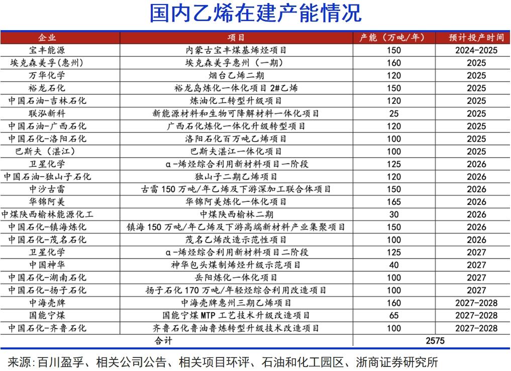 目前我国新建乙烯产能为每年2575万吨,其中2025年将有超过每年1000万吨。而且,在规划产能受到影响的情况下,现有的新增产能已经完成——在过去的五年里,房地产承压,国际经济环境不确定,新增产能的规划和实施趋于保守。