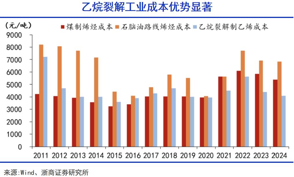 中国的煤制乙烯和美国的乙烷裂解乙烯都有相当大的成本优势——中国有丰富的煤炭能源,而页岩气革命后,美国的乙烷价格大幅下降,这两条路线都优于其他国家的石脑油路线。因此,中国和美国在乙烯行业对其他国家造成了强烈的挤压。