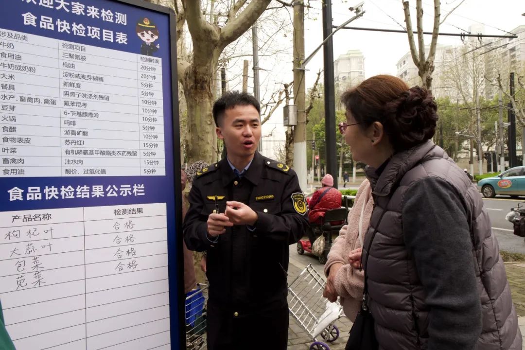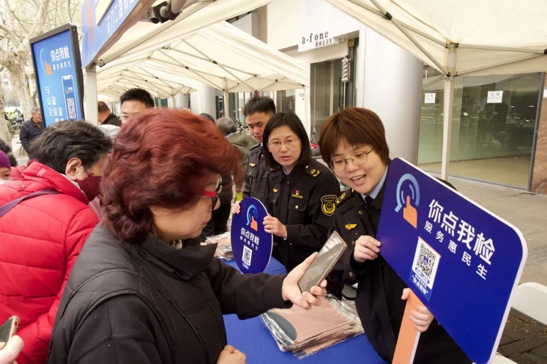 在食品快检服务点的另一端,静安区市场监管局的检查人员正在帮助居民扫描“你点击我的检查” 活动二维码服务惠民生,参与问卷调查。