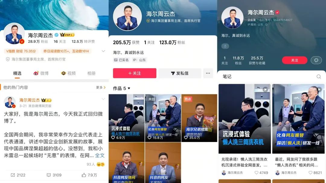 流量下降后,海尔和周云杰反应迅速,在多个平台上开通了周总的个人社交账户。截至3月31日,周云杰抖音账号共发布5个视频,粉丝数达123万;微博粉丝数达28.9万,转评超过12.5万;小红书粉丝超过11.8万,甚至还有自己的“站姐”。