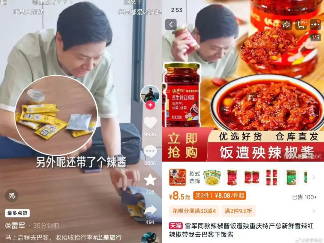 比如雷军穿了几次小米工作服,被很多粉丝种草。小米限量上架800件,短短几分钟就被粉丝抢购一空,二级市场一度溢价。即使雷军去巴黎出差,两罐辣酱也能在不经意间暴露出来,迅速盘活即将倒闭的品牌,让一个月的线上销售额超过700万。网友开玩笑说“雷总足以帮助品牌节省所有代言费”。