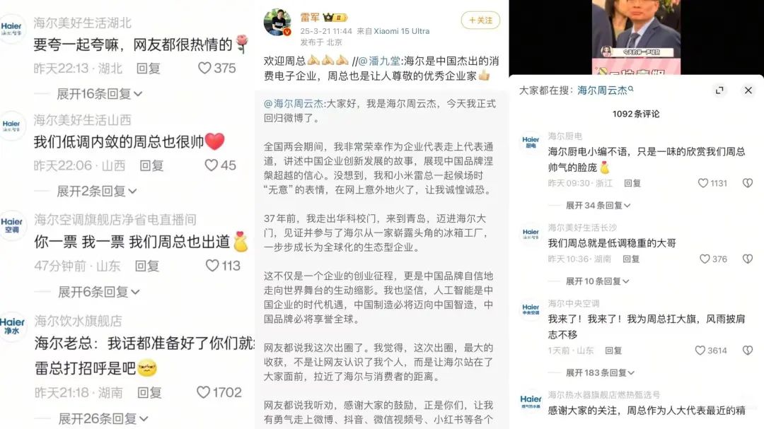 从品牌角度来看,雷军IP就像小米生态的“超级入口”,通过个人影响力加速汽车等新业务的破圈。周云杰更像是海尔年轻转型的“手术刀”,将用户互动数据转化为生产力,迫使产品研发。