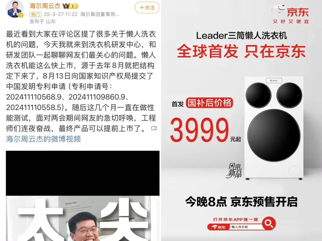 很多网友在海尔集团账号评论区发言周总,让海尔开发一款集洗内衣、棉袜、鞋子、衣服于一体的懒人洗衣机。海尔随后表示,周总看到并认可了这一想法,工程师已经开始研发,即将推出。在客户的热情祈祷下,海尔团队在72小时内完成原型设计并开始预售,首周销量突破8万台,预计4月份即可交付,速度很快。