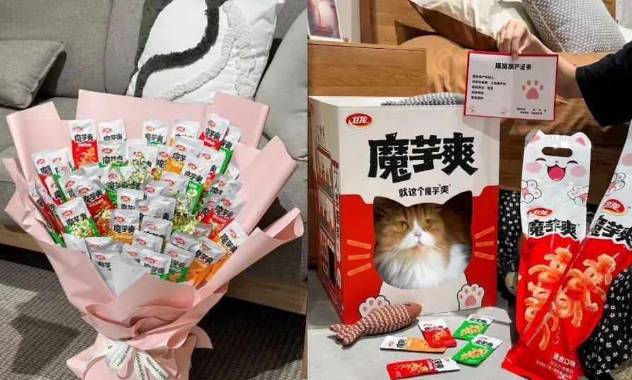这些内容平台不仅是短视频和社交媒体的热点发源地,也是帮助辣味休闲零食与年轻人更近距离交流的主要位置。比如卫龙推出的魔芋花束和魔芋猫窝都跟上了热点。