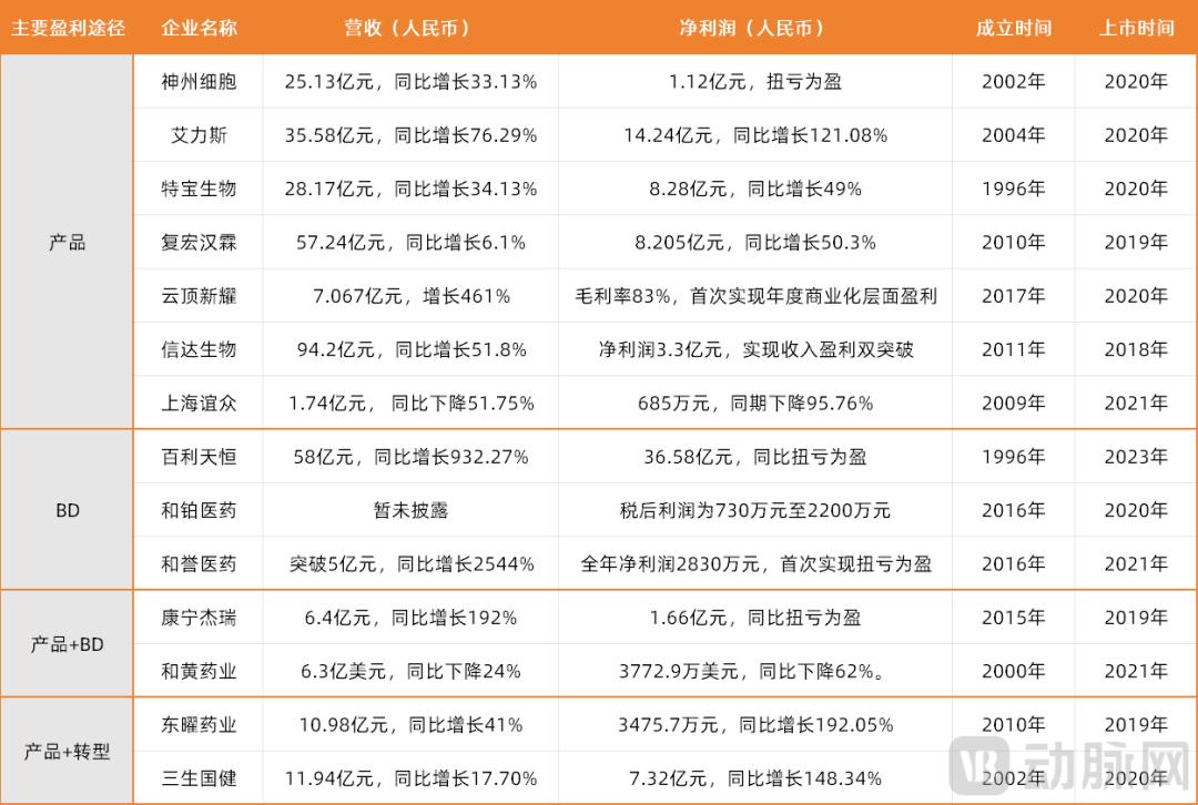 Biotech除了仅仅依靠产品或BD来实现盈利外,还有一些基于多样化发展的Biotech,以产品为基石,结合BD。、CXO业务,以及降低成本的策略,实现了盈利。例如,康宁杰瑞和黄药业依靠“商品” BD“这种双重方式实现了利润;东曜医药、三生国健依靠“商品” “转型”这一双驱动策略实现了盈利。