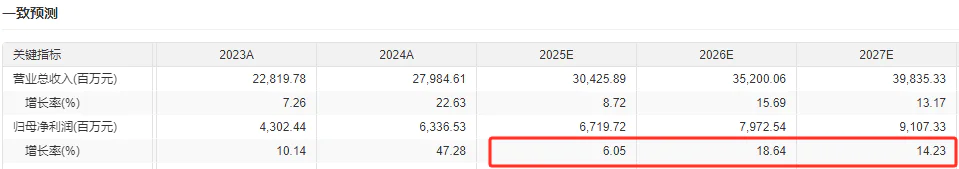 从上面可以看出,2024年恒瑞药业的高收益增长是由于BD合作的一次性首付收取,难以说困境翻转了。这也可能是机构预期恒瑞2025-2027年归母净利润增速下降到15%-20%的重要原因。