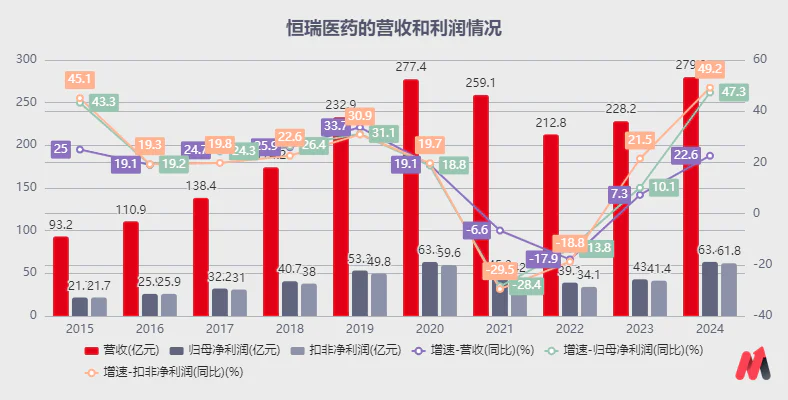 2024年,恒瑞药业实现营收279.85亿元,同比增长22.63%,归母净利润63.37亿元,同比增长47.28%,扣除非净利润61.78亿元,同比增长49.18%,公司业绩大幅增长,营收和净利润均创下新高,利润增速远超营收增速,也使市场振奋不已。
