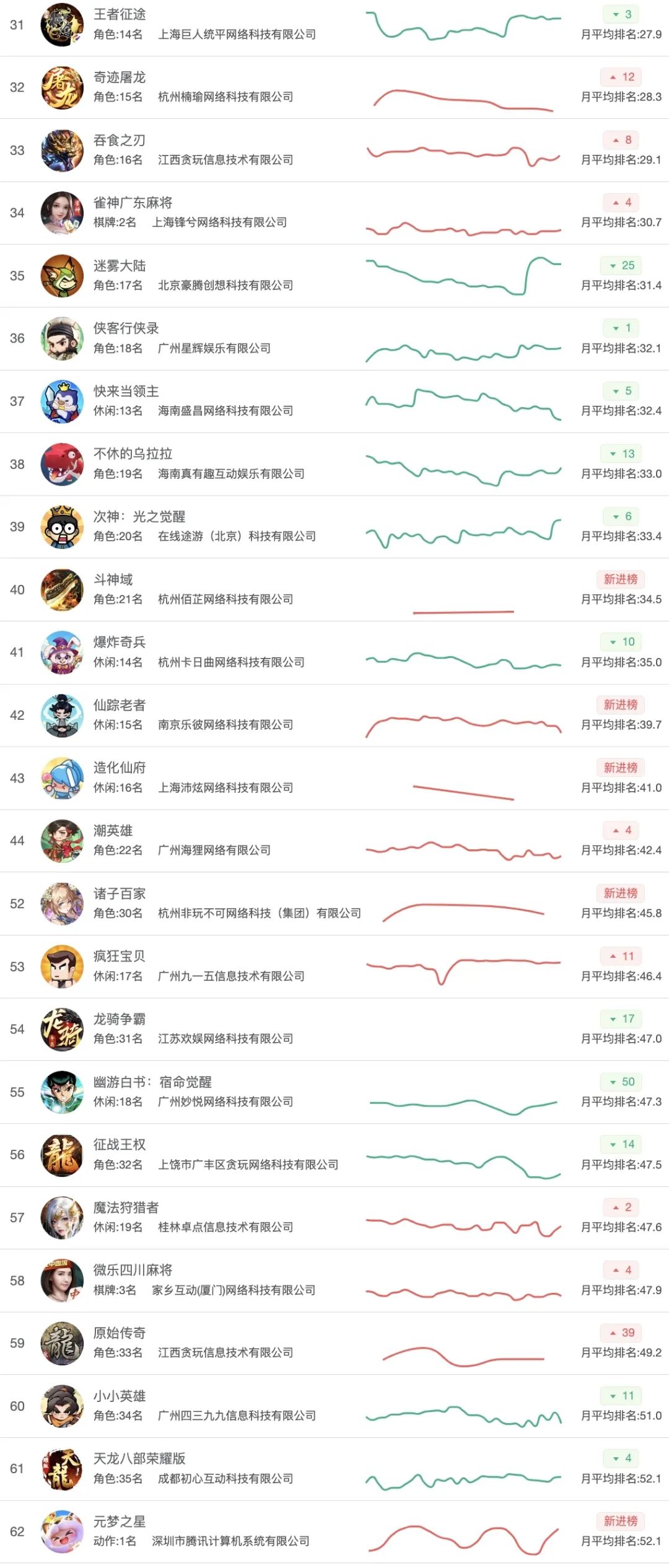 本期一批传统主题游戏表现突出,如《荣耀世纪》排名第12位,《武侠明星》排名第8位,排名第26位;《原始传奇》《奇迹屠龙》《吞食之刃》《斗神域》等。都有不错的排名——小游戏的下沉、复古、怀旧还在继续。