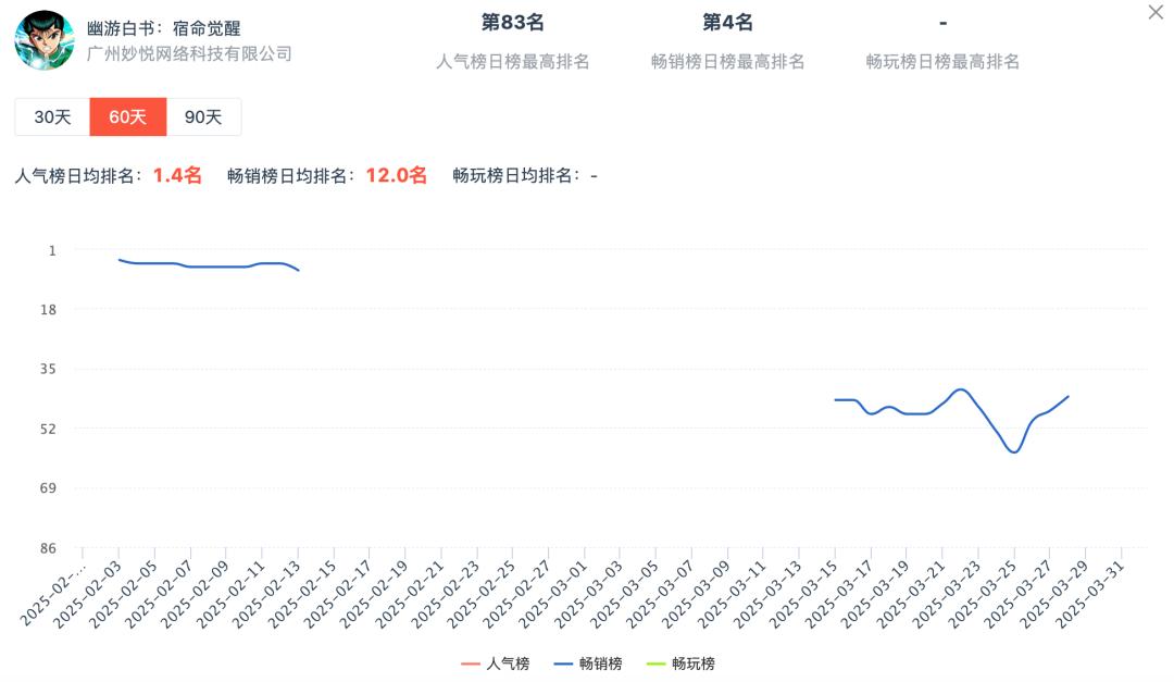 值得注意的是,2月份的IP黑马——星辉的《仙境传说:黎明》在3月份略有下降8位,排名第17位;同样是2月份的IP黑马,广州妙悦的《幽游白书:宿命觉醒》,3月份暴跌50位(2月份作为新游冲到第五位),游戏甚至在2-3月份在榜单上“失踪”了一段时间。2月份表现强劲的新游,3月份出现了分化,或者是因为对IP用户的接触有限,或者是因为没有“新游加持”,只能在榜单上用自来水排列,原型就显露出来了。