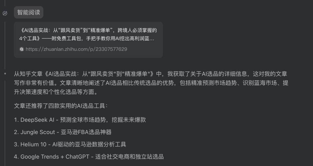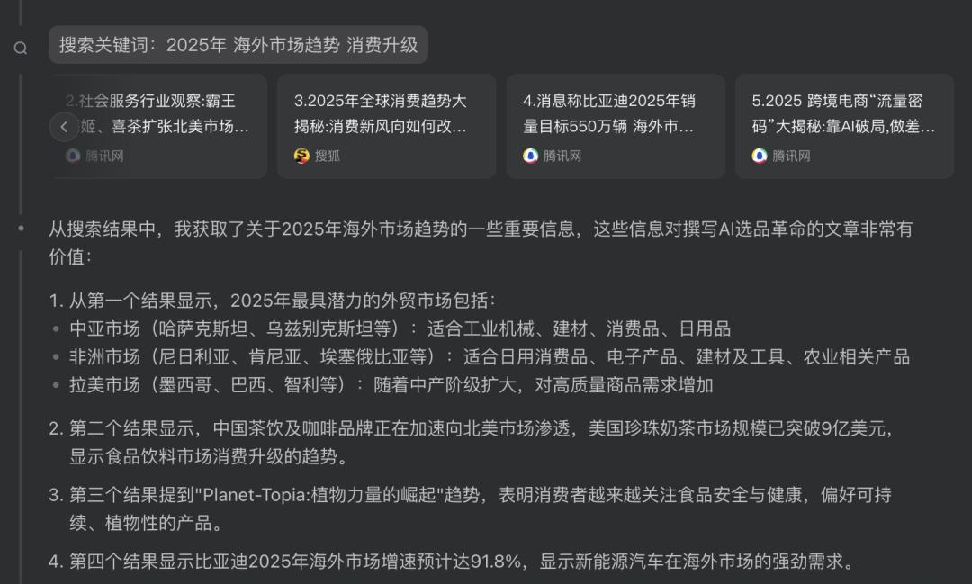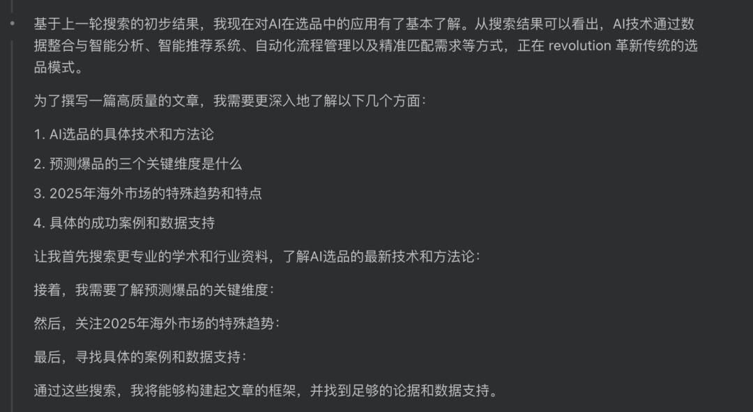 还有一点,我给它的任务是写一篇关于“AI选款革命:用大数据预测2025年海外爆款产品的三个维度”的文章。
