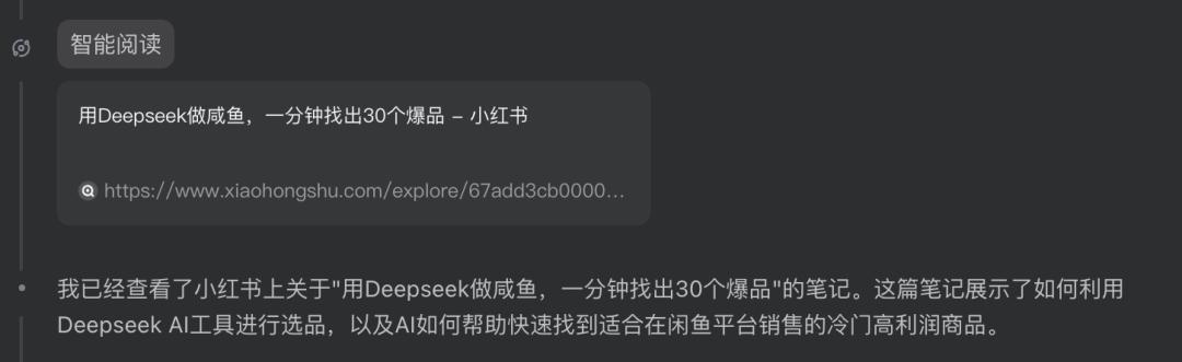 我在小红书上查了一下关于“用Deepseek做闲鱼,一分钟发现30个爆炸”的笔记;这个笔记展示了如何使用Deepseek。 AI工具的选择,以及AI如何帮助快速找到适合在闲鱼平台上销售的冷门高利润商品。