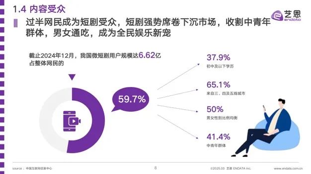 根据艺恩的数据,短剧的受众比年轻人高41.4%。你不妨问问你的朋友“天道酬勤”。、“云开日出”、“宁静而深远”、「花开富贵」,睡前给您发一篇“熬夜三大坏处”的文章,是否进入视频号连夜刷起短剧?