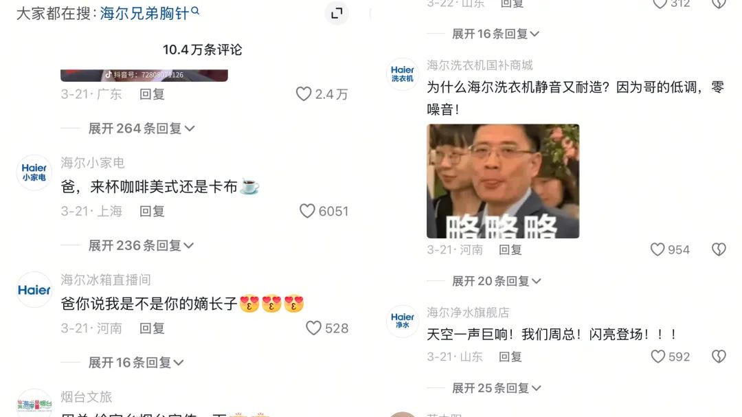 毕竟雷军的受欢迎程度祝福了海尔的“田地”。在Tiktok中,周云杰的粉丝数量增加到122万,而小红书的粉丝数量为12万。集团高管组队开户,评论区下@海尔机器人、@海尔洗衣机、@海尔空调等账号争相互动,不愿意放过这种财富。