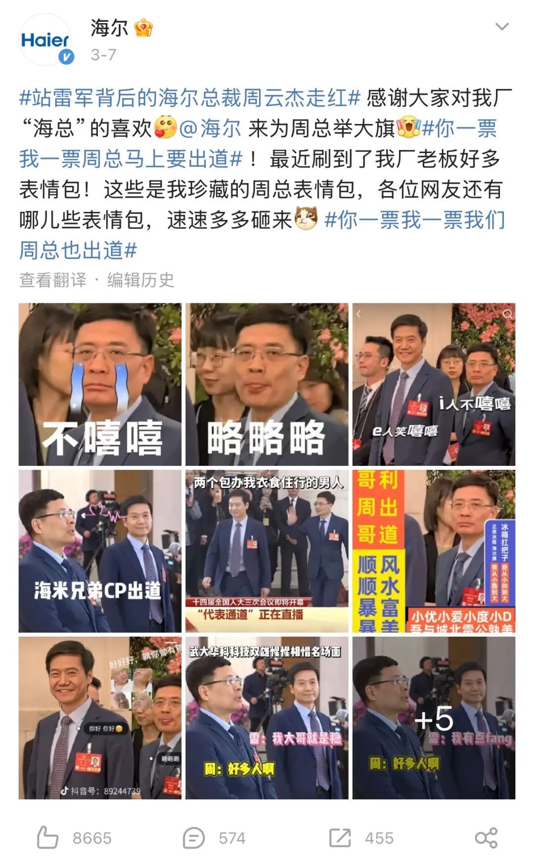海尔集团对雷军意外带来的泼天流量做出了快速反应。在CEO周云杰被网友玩梗的时候,“制冷系总裁”“没有山东小葱高的男人”,品牌矩阵账号竞相冲浪为老板站台。虽然官方号的粉丝总数比不上雷军,但蓝V们在连夜更新老板最新表情包的同时,推出了“你一票我一票周总马上出道”的微博话题,立刻将人气推向了巅峰。