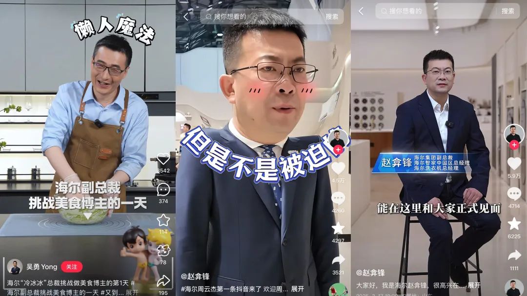 而且为扩大宣传阵地,海尔的选择是组成高管天团,这个盛况也被嘲讽为“雷军一下子孵化了十个网红账号”。继老板出道之后,海尔各产业线的高管们仿佛收到了KPI一般的团队开号,各自建立了自己的个人设计。比如海尔集团副总裁、制冷行业总经理吴勇,在挑战做美食博主的同时,主要推广“不会做美食的设计师不是好总裁”,向用户播放自己的总裁沉浸式vlog。管理者通过玩梗,分享生活接近年轻人的世界,比如这样,都拉近了海尔与消费者的距离。