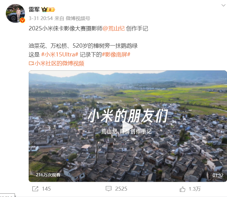 作为微博的高频客户,雷军之前在微博上与用户互动,积累了很多人气。然而,3月29日事故发生后,雷军最近在3月31日晚8点54分发布了一条微博,并没有提到事故。内容是“油菜花、万松桥、520岁樟树旁的鹦鹉绿”。 #小米15Ultra# 记录#影像南屏#。”