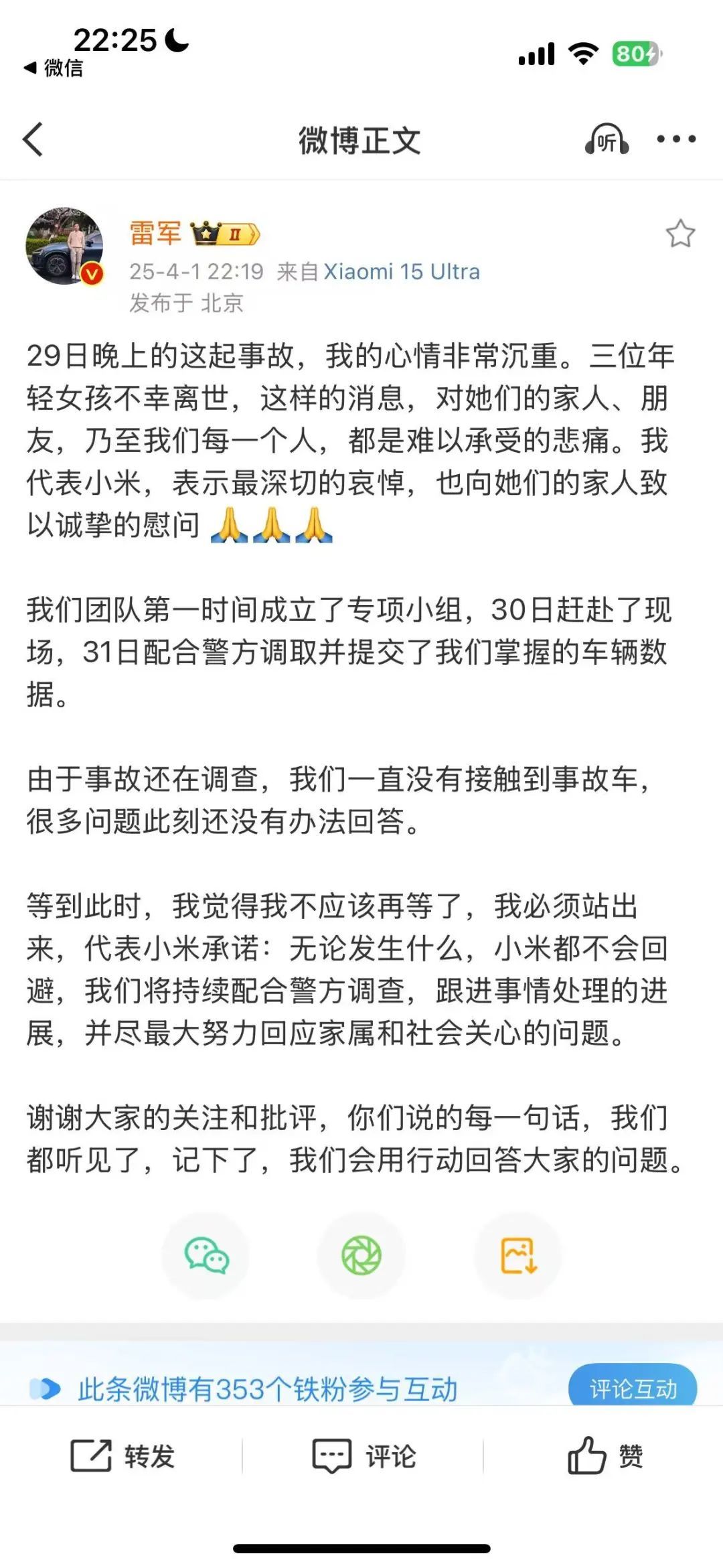 雷军说情绪很重,代表小米最深的哀悼。因为事故还在调查中,我从来没有接触过事故车,所以目前还没有办法回答很多问题。