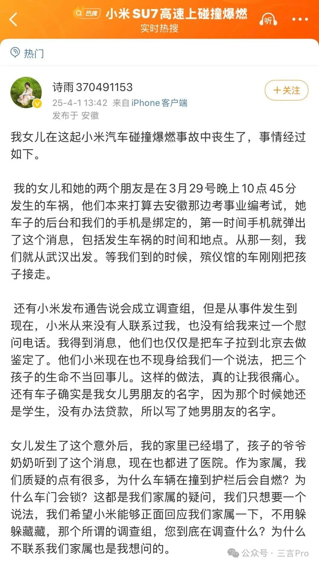 下午13日,小米发表声明:42.经微博认证的受害者家属、驾驶车辆的受害者母亲张女士在微博上讲述了这件事,并提出了质疑。“作为家庭成员,我们有很多问题。为什么汽车撞到护栏后会自燃?门为什么锁?”
