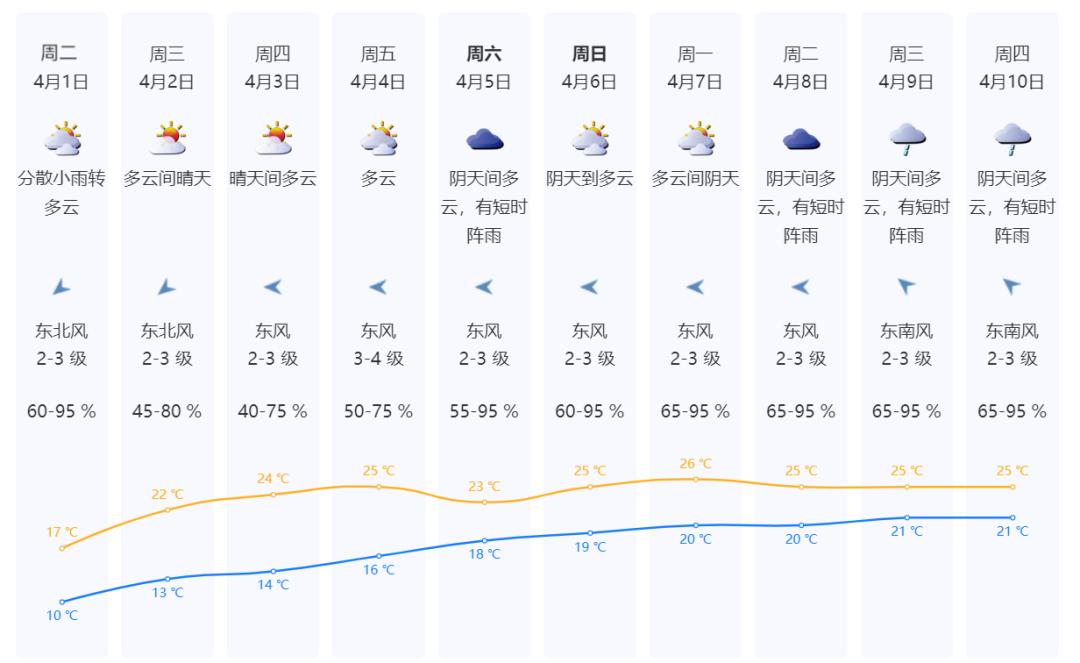 四月一日,小雨分散转多云;10℃-17℃;东北风2-3级;相对湿度为60-95%。