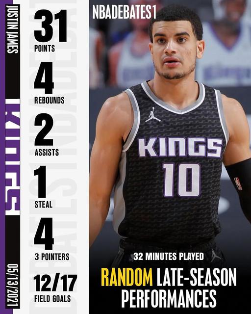 2021 年 5 月 13 每天,出场打球 32 分钟,17 投 12 中,拿下了 31 分,4 个篮板,2 次助攻,1 第二次抢断。其中,投入 4 记三分球。