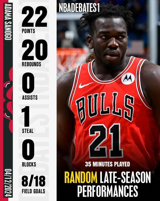 2024 年 4 月 12 每天,出场打球 38 分钟 18,投 8 中,拿下了 22 分,20 个篮板,1 第二次抢断。因为膝盖受伤,二月份,公牛队选择裁掉他。
