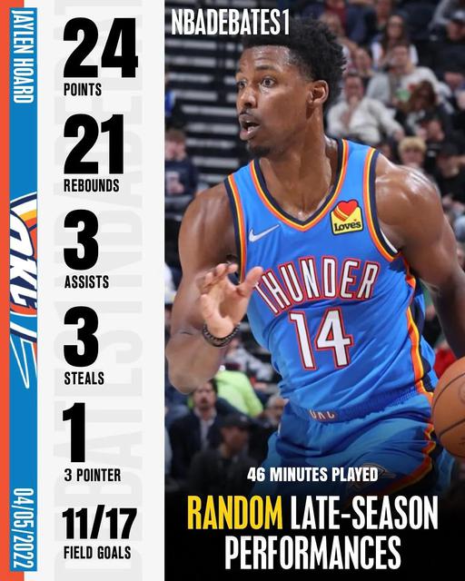 2022 年 4 月 5 每天,出场打球 46 分钟,17 投 11 中,拿下了 24 分,21 个篮板,3 次助攻,3 第二次抢断。其中,投入 1 记三分球。