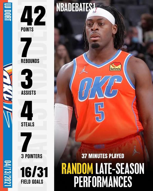 2021 年 4 月 13 每天,出场打球 37 分钟,31 投 16 中,拿下了 42 分,7 个篮板,3 次助攻,4 第二次抢断。其中,投入 7 记住三分球。多尔特目前在俄克拉荷马雷霆效力,他是一名优秀的后卫,攻防兼备。