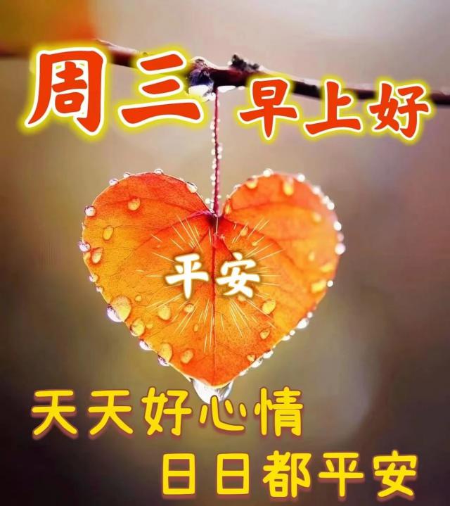 我无法阻止的是,雁传出了一封信。我看不到的是微风吹散了叶子。我看不到的是,我的思念充满了我的心。美好的早晨,我的早安问候来了。祝你:开心不愁,开心无忧;感情醇厚,浪漫依旧;名利双收,幸福永远!星期三,早上好!