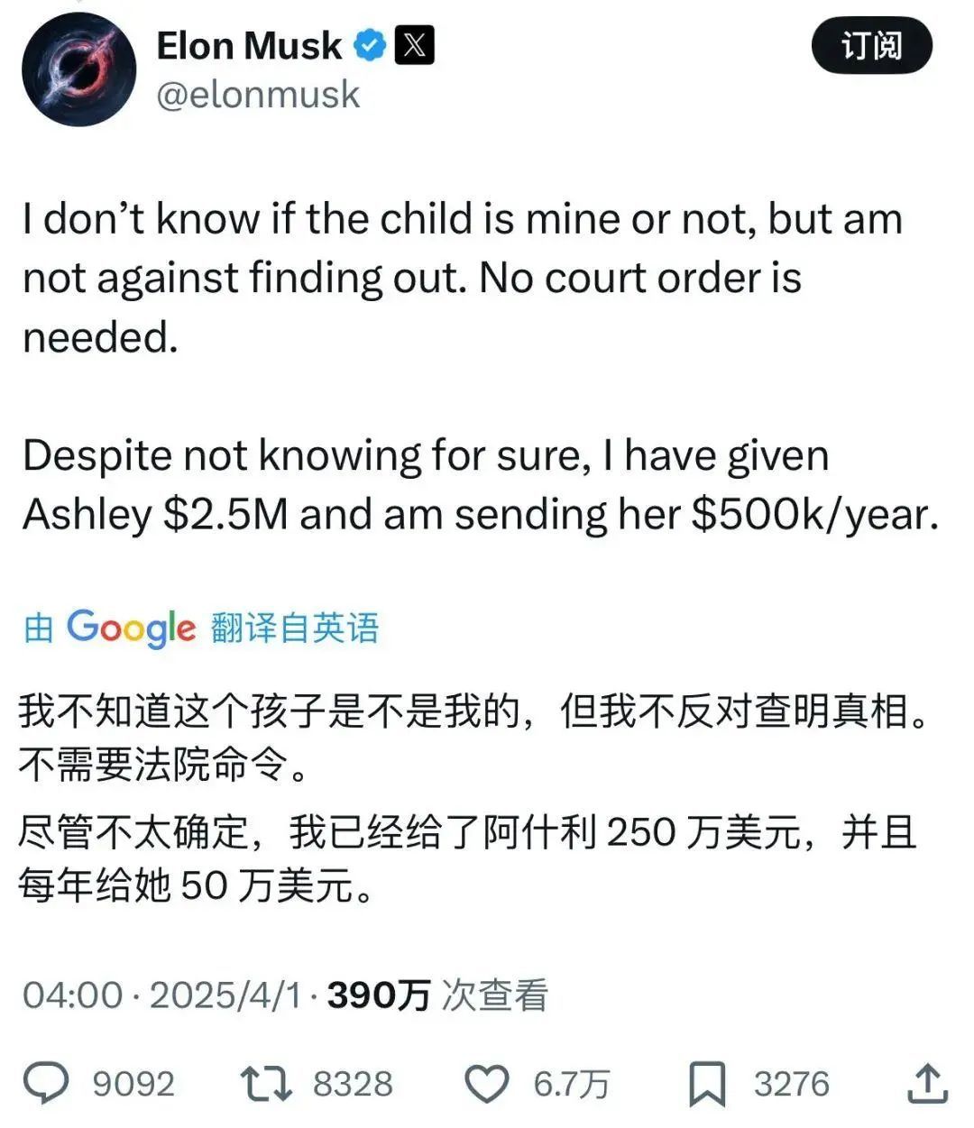 在X中,马斯克回复了这份报告:“我不知道孩子是不是我的,但我不反对弄清楚。不需要法院指令。虽然我不确定,但我已经给了艾希莉250万美元,每年给她50万美元。”
