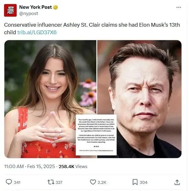 据媒体报道,艾希莉在X发表声明称:“五个月前,我迎来了新的生活,埃隆·马斯克是孩子的父亲。我之前没有透露这件事是为了保护孩子的隐私和安全。”