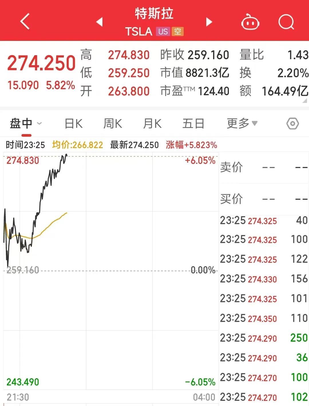 北京时间4月1日晚,美股三大指数集体低开,盘面上,截至23点26分,特斯拉开盘直线拉升5.82%,报274.25美元。