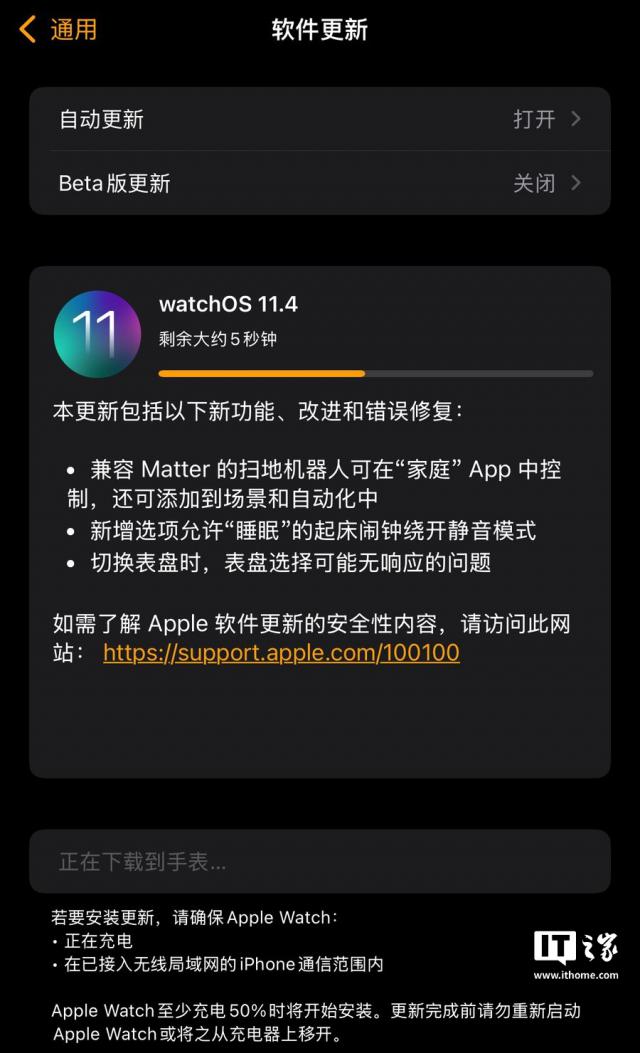 升级需保证 Apple Watch 电量≥ 50% 并连接 Wi-Fi:通过设置手表端 - 通用 - 完成软件更新;iPhone 客户需使用 Apple Watch 应用程序操作。截至发稿,全部适应 Apple Watch Series 4 或者上述型号都可以获得更新。