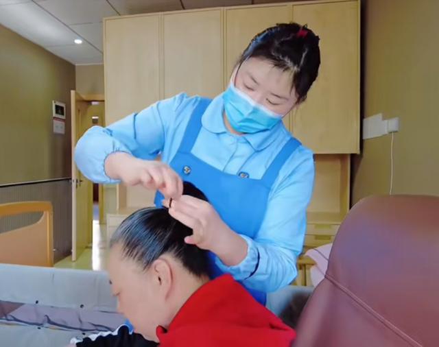 图片显示唐开燕正在帮助老人梳头。/ 提供面试对象