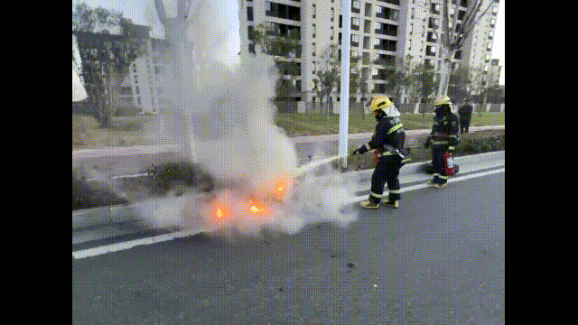 当消防救援人员到达现场时,电动汽车仍在燃烧,并伴有大量烟雾。消防救援人员立即出水灭火,灭火,继续冷却电池出水,避免再次燃烧。