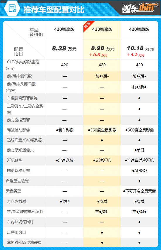 推荐车型为 420 智豪版,价格 8.98 万元。相对较低的一种设备 420 智能版,推荐车型增强了前侧安全气囊、主驾驶座电动调节、后座出风口和车内。 PM2.5 过滤系统。此外,它还将倒车影像升级为 360 全景图像,包含透明底盘 /540 度数图像,而方向盘材料也由塑料改为皮革,握感更好。这些配置的结合 6000 从块的差价来看,个人感觉更值得升级。