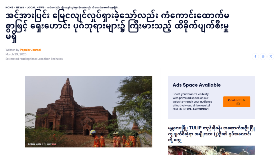 三月二十九日,缅甸新闻网站Popular News援引曼德勒省良乌镇消防部门的消息称,尽管3月28日地震强度较大,但幸运的是,蒲甘佛塔位于蒲甘古文化区,并未受到重大损害。