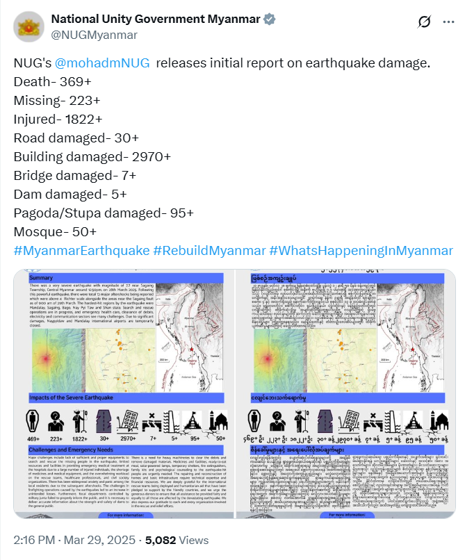 三月二十九日,缅甸民族团结政府在X平台上发布了推文截图。