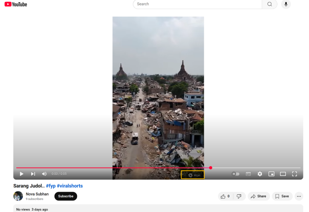截取网络视频的关键帧进行反向搜索,可以在YouTube平台上找到一个内容相似的视频。该视频于3月29日上传,视频右下方标注明确“Wan”“符号水印。