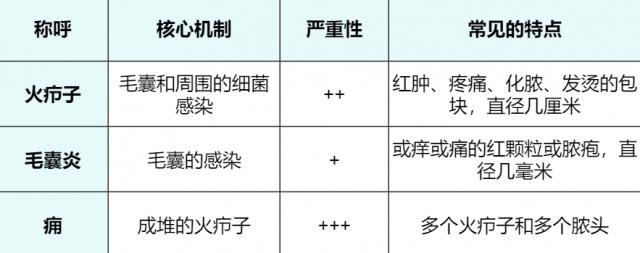 以上是微观示意图。可以看出,毛囊炎、火疮、疖子有一些共同点,也有一些区别。我们用表格梳理了它们之间的比较。