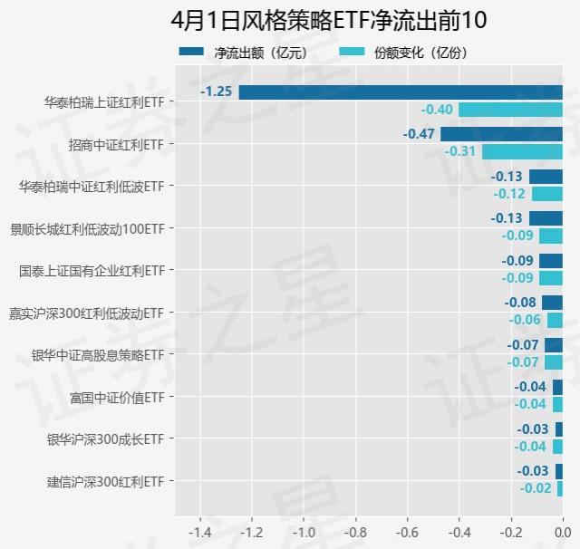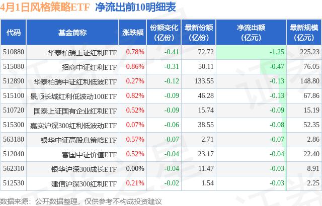 当天有 15 只风格策略 ETF 资金净流出,其中华泰柏瑞上证红利排名第一。 ETF(510880),份额下降 4050.0 万份,净流出额为 1.25 亿元。