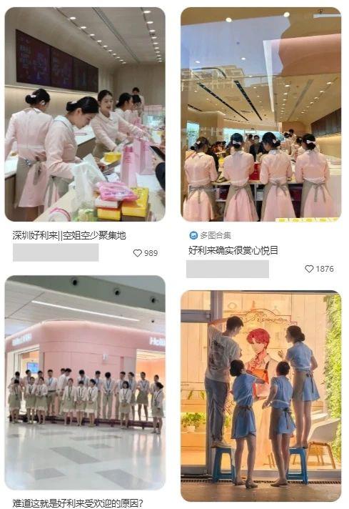 去年 12 月 24 当天,商场里的圣诞节气氛浓厚。好利来华南第一家店在深圳开业。与北方蛋糕的“甜蜜暴击”相比,高个子美女店员更快引起了网友的热烈讨论。大家喊“都是漂亮的小姐姐”,有网友开玩笑说这是“空姐少集中的地方”,“制服诱惑”随时上演。
