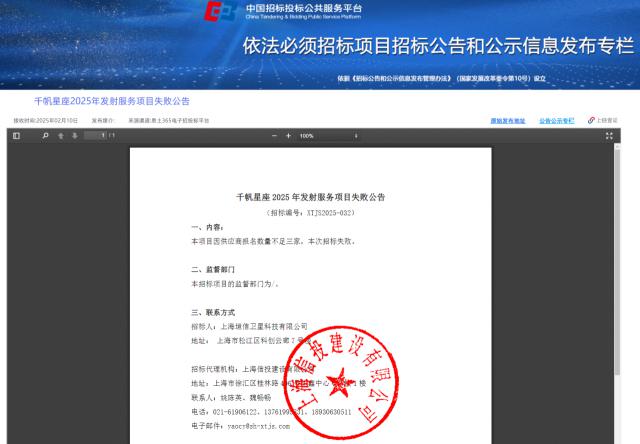 2025 年 2 月 5 日,备受期待的《千帆星座》 2025 年度发射服务项目招标公告发布,但由于供应商注册不到三家公司宣布流标,随后于当月发布。 11 每天再次发起招标,仍然因为同样的原因而流标。