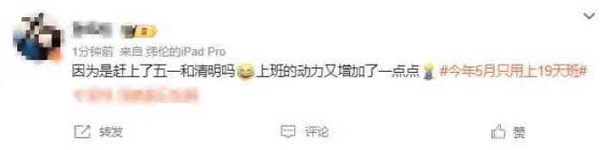 据悉,今年五一有五天假期,从五一假期(5月1日-5日)开始,从端午节假期(5月31日-6月2日)结束,再加上周末,整个五月只用了19天的工作,稳定了农民工的“梦中情月”!