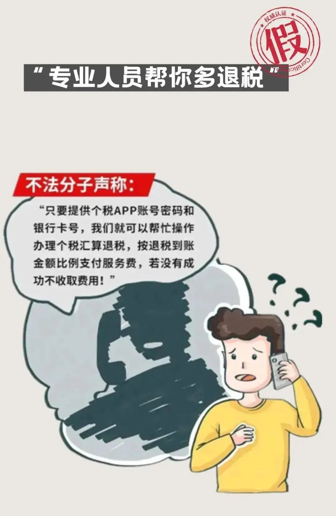 2.专业人士帮助退税:骗子冒充税务机关工作人员,声称可以通过“人工退税绿色通道”加快退税到达率,要求提供身份证、银行卡号等个人信息。